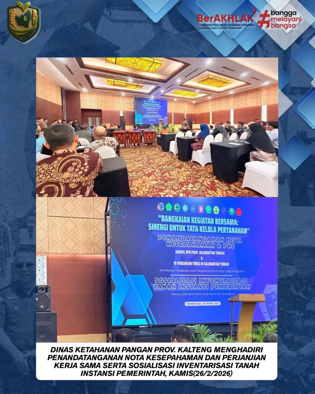 Dinas Ketahanan Pangan Prov. Kalteng Menghadiri Penandatanganan Nota Kesepahaman dan Perjanjian Kerja Sama Serta Sosialisasi Inventarisasi Tanah Instansi Pemerintah, Kamis(26/2/2026).